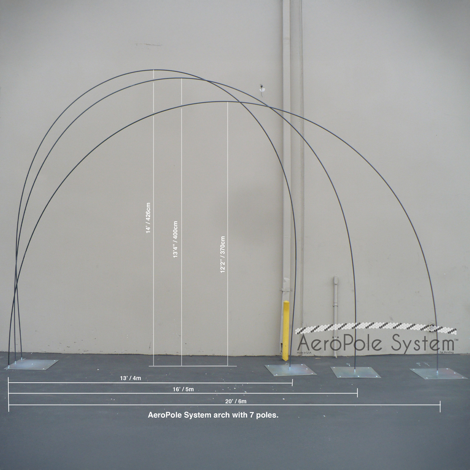 Sätt ihop dina AeroPole-sektioner och linda varje skarv med en spiral av gaffatejp, ca 20–25 cm lång. Klustra dina ballonger och trä dem på AeroPolen. För att skapa en båge kan två personer lyfta ändarna och sätta dem över pinnarna på bottenplattorna.