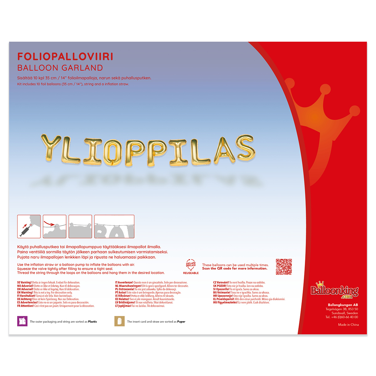 Innehåller 10 st 35 cm / 14” folieballonger, snöre samt ett blåsrör.